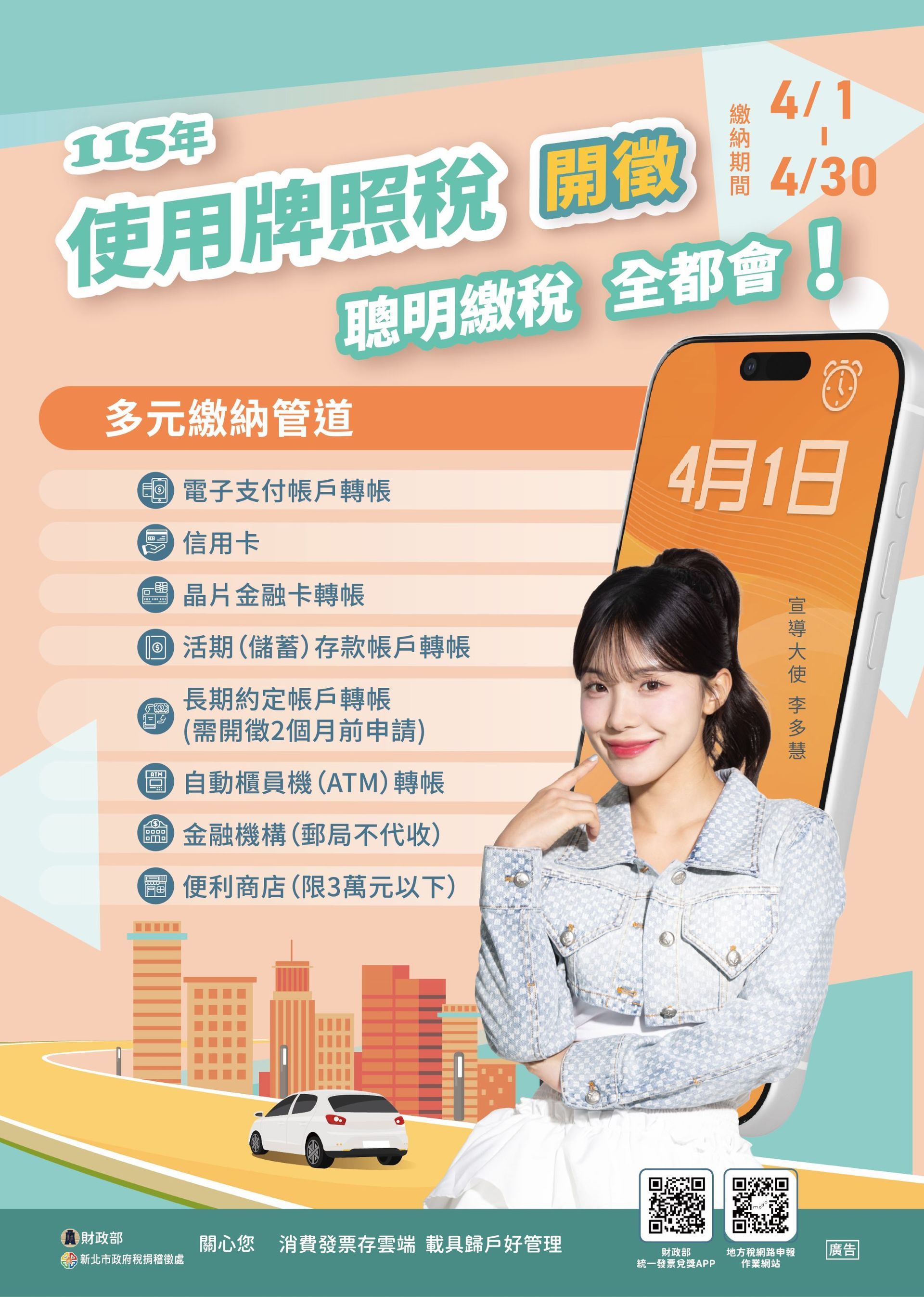 115年使用牌照稅繳納期間自4月1日起至4月30日止,請如期繳納。 申請使用牌照稅繳款書歸戶,稅單整合成一張,不怕漏繳最安心!請上地方稅網路申報作業網站申請。 新北市政府稅捐稽徵處、石門區農會關心您。